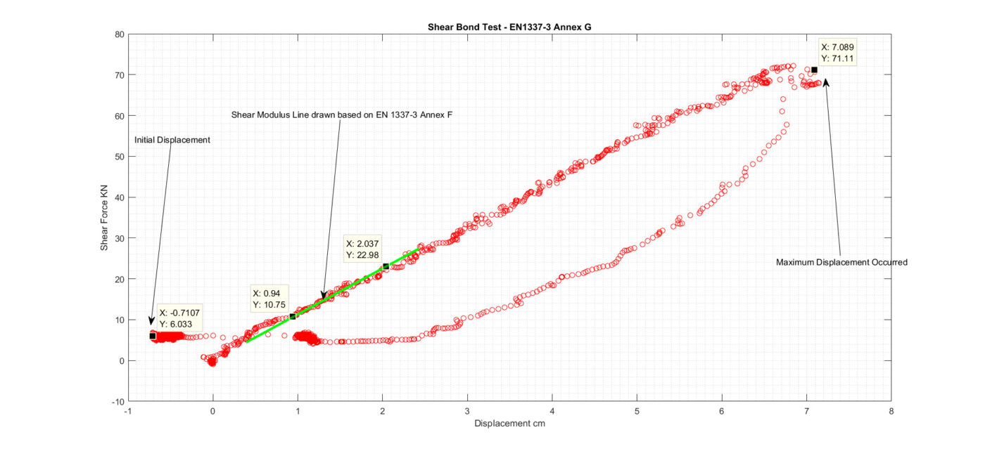 شرکت آسام روف بعد از پیگیری های فراوان، طراحی و تولید ابزار مورد نیاز آزمون و استفاده از تکنیک های پردازش داده های دیجیتال، اکنون قادر به انجام آزمون بارگذاری برشی و ترسیم نمودار تنش کرنش به طور کامل می باشد. در تصویر ذیل نمودار ترسیم شده پس از انجام این آزمون در آزمایشگاه شرکت آسام روف بدست آمده است. مشخصات فنی قطعه مورد آزمایش قرار گرفته را می توانید در این لینک بیابید